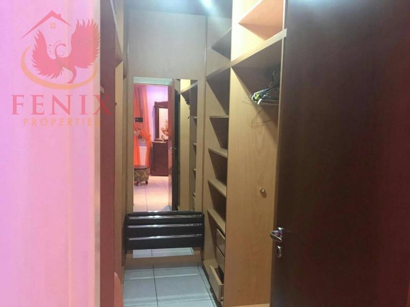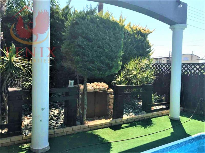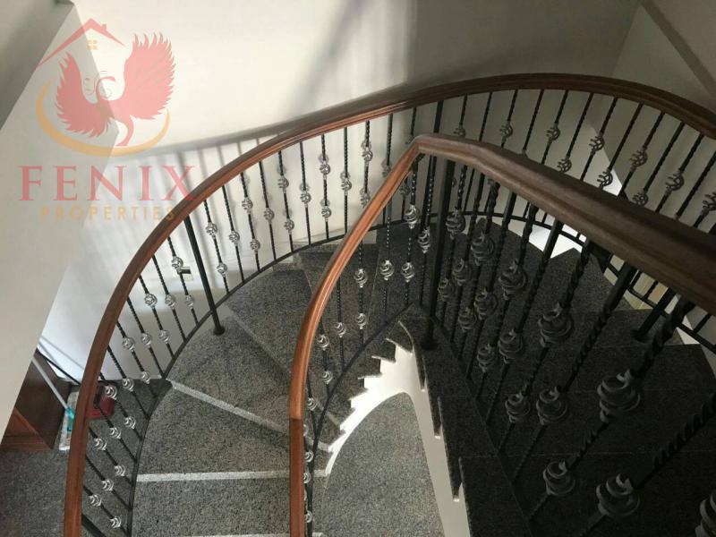 The ground level has a spacious sitting/dining area, contemporary kitchen with all electrical appliances, guest WC, double glazed windows, a/c, central heating. Adjacent to the kitchen there is another smaller bedroom provided also with a private bathroom sufficient to accommodate a domestic helper. Patio doors open onto the outstanding garden with private swimming pool. On the upper level there are 4 bedrooms, master en suite, full main bathroom with jacuzzi, office, and laundry room. The villa is fenced around for full privacy, landscaped gardens.
