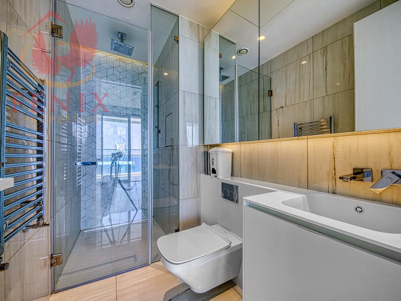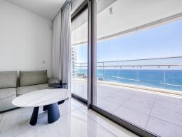 The open-plan living and dining area is framed by floor-to-ceiling windows that flood the home with natural light and open directly to uninterrupted sea vistas. A modern kitchen with top-quality appliances and premium finishes complements the space, making it both practical and sophisticated. The master bedroom features its own en-suite bathroom, while a second generously sized bedroom and additional WCs provide comfort and convenience. Furnishings by Gianfranco Ferré Home, together with underfloor heating, VRV air conditioning, and smart home systems, ensure a lifestyle defined by elegance and ease.
