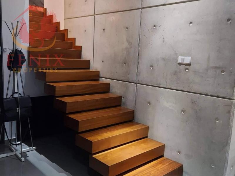 The ground floor is comprised of a spacious living room of around 100 sq.m with a fireplace, guest WC, a modern kitchen with built-in appliances, and an island inside.