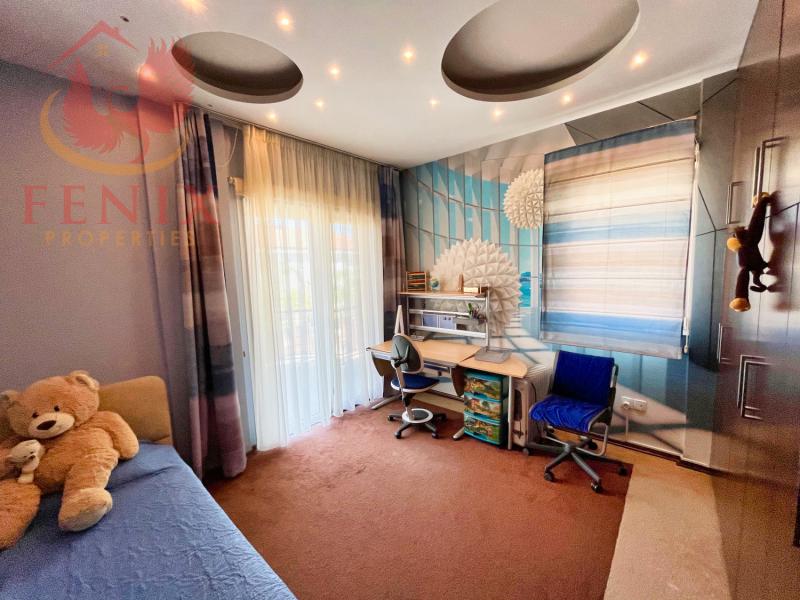 The upper floor comprises four ample bedrooms, two luxurious bathrooms with generously sized bathtubs, a laundry room, and an abundance of storage space with multiple closets. Two balconies offer sweeping vistas of the beautiful surrounding landscape. The villa is equipped with central gas heating, ensuring a snug and warm ambience during cooler months.